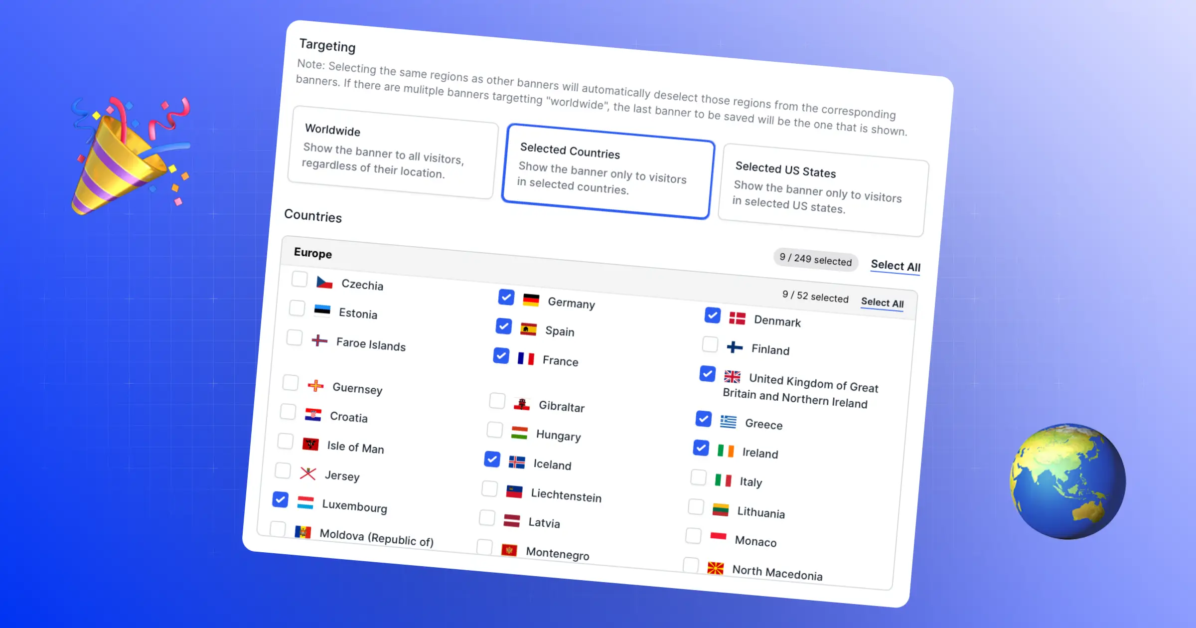 Then specify where each banner is displayed—globally, by continent, country, or even specific U.S. states. It's designed to help you comply with regional data protection laws like GDPR in Europe or CCPA in California by showing appropriate banners based on the user's location.